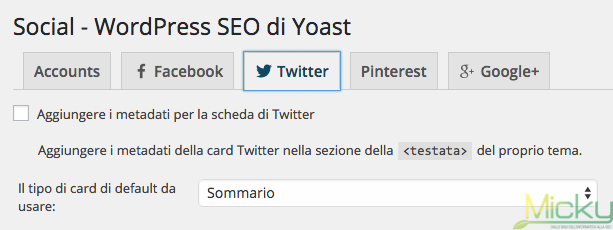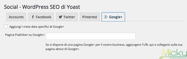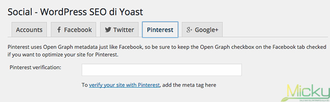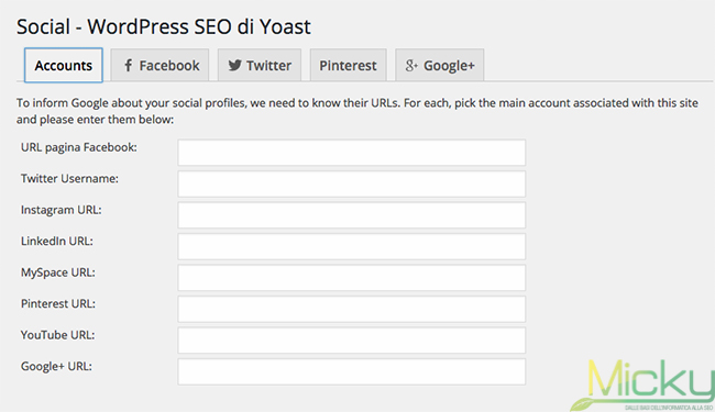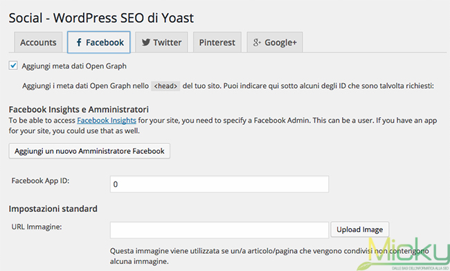 Questa scheda, praticamente una grossa novità di questo plugin, consente una gestione SEO Social del nostro blog grazie all’inserimento delle URL delle nostre pagine su Facebook, Twitter, Google plus, Pinterest, MySpace, LinkedIn e Instagram. Nella scheda Facebook inoltre si potrà inserire l’amministratore della pagina Facebook per consentire al blog di accedere ai dati di Facebook Insights. Successivamente si potrà inserire i meta dati Open Graph. Per chi non conoscesse queste impostazioni posso aggiungere che, di solito, si lasciano a default quindi deselezionati.
