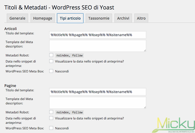 Per chi fosse alle prime armi dico subito che per impostazione di default, il plugin WordPress Seo by Yoast, non necessita di chissà quale modifica e questa parte di impostazioni potremmo quindi anche lasciarla così com’è. Per chi invece vuole andare più in profondità, vado a descrivere le funzioni brevemente: