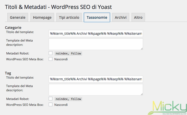 La scheda home page, tipi di articolo, tassonomie e archivi, sono dedicati alla gestione delle URL di queste sezioni per far capire ai motori di ricerca come vogliamo che queste “zone” del sito vengano indicizzate.
