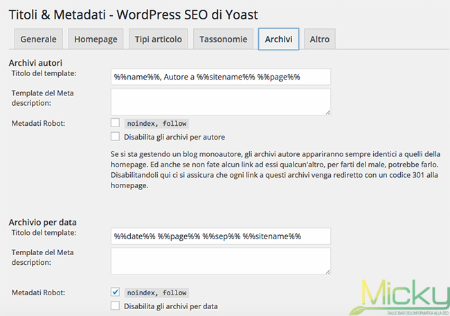 Infine, almeno riguardo questa sezione, la scheda altro che, seppur in secondo piano, consente delle belle opzioni. Una su tutte, la prima, che consente di non indicizzare le pagine secondarie degli archivi. Anche in questo caso, per la maggior parte degli utenti, è meglio lasciare a default, ossia non selezionata.
